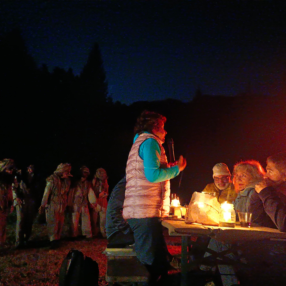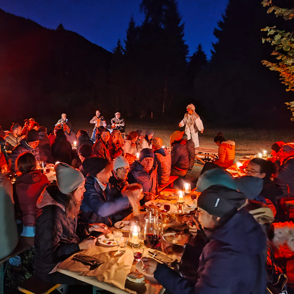 In una cena stra-ordinaria e senza tempo ai limiti del bosco, dove è più sottile il limite fra visibile e non visibile, accompagnati dalle antiche maschere di carnevali passati, animeremo quel rito di cibo, vivande e risate, per celebrare la vita e riscoprire un lato primitivo di noi.